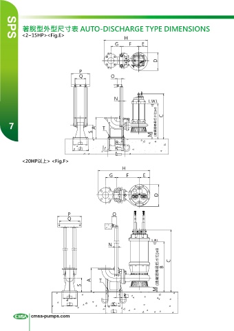 著脫型外型尺寸表 AUTO-DISCHARGE TYPE DIMENSIONS <2~15HP><Fig.E> H SPS G F E D P Q O N L.W.L 7 A T (連續運轉最低水位)≥B C S M I R J K L <20HP以上> <Fig.F> H G F E D P O Q L.W.L N (連續運轉最低水位)≥B B C A T S M I R J K L cmsa-pumps.com